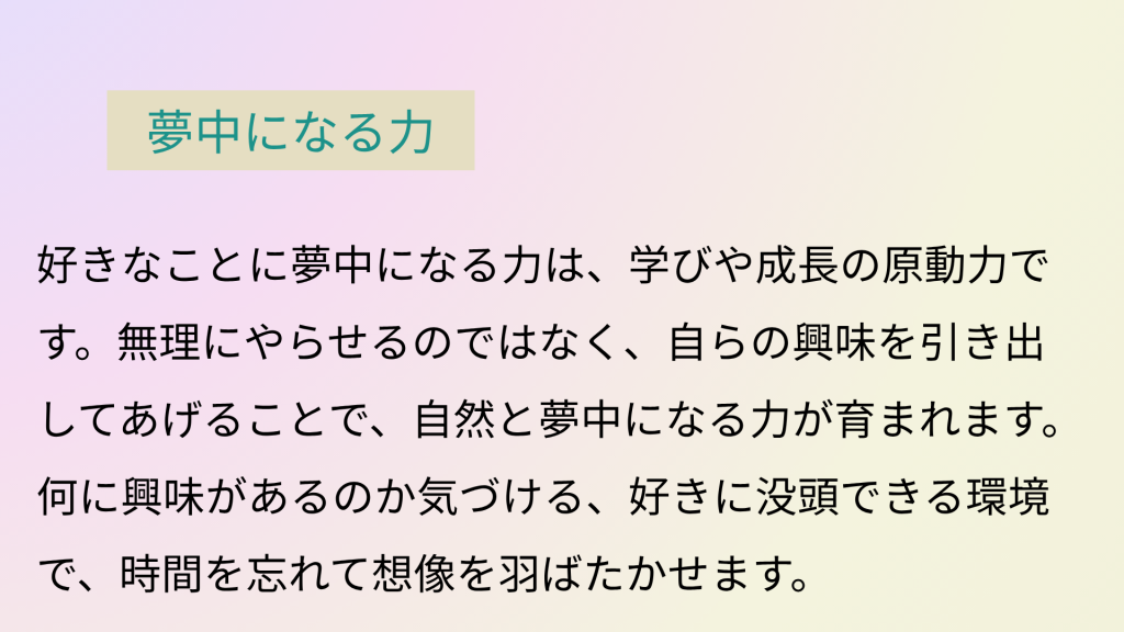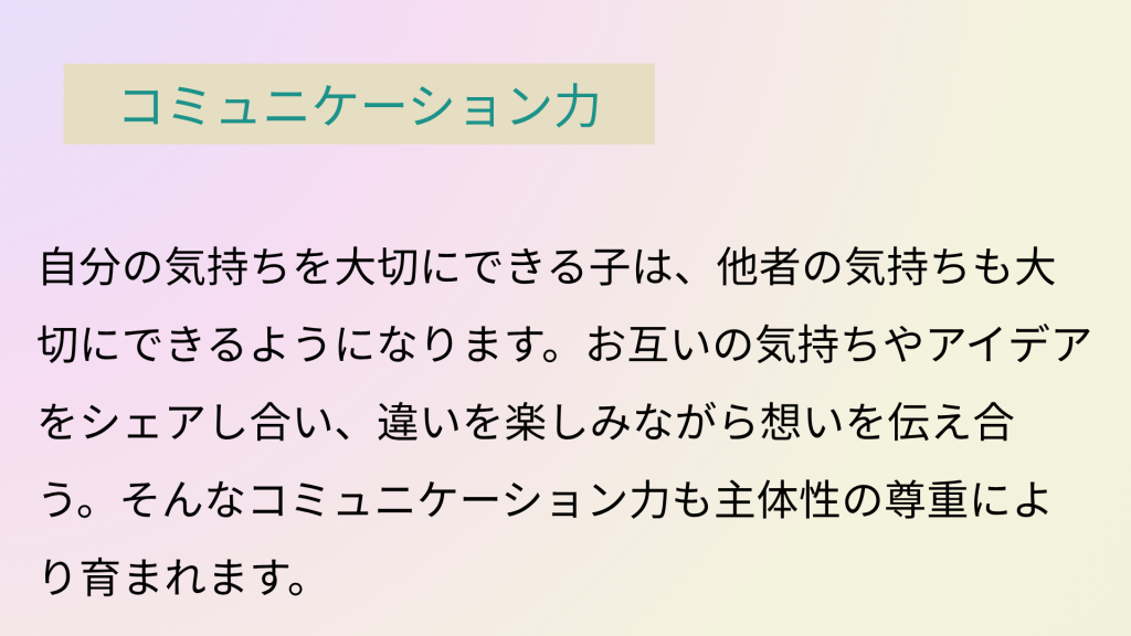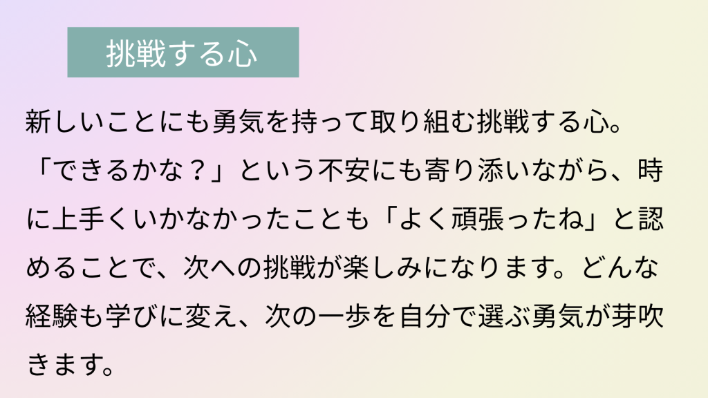 子どもたちが自分らしく育つためには、自分で考えて判断し、行動する力❝主体性❞を育むことが重要です。主体性を持つ子どもは失敗を恐れず挑戦し、自分を大切に、ひいては他者も大切にできるような大人へと成長します。